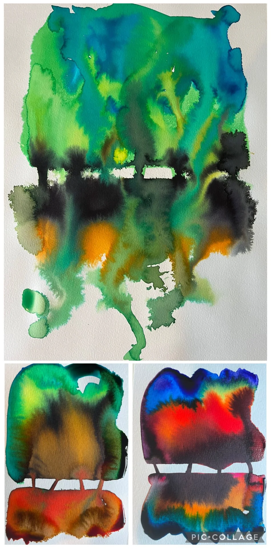 Du behöver inte samla på dig massa färger, 2-3 räcker. Lite fuktat akvarellpapper och sedan bara droppa på färg. Magiskt kul och läckert:)