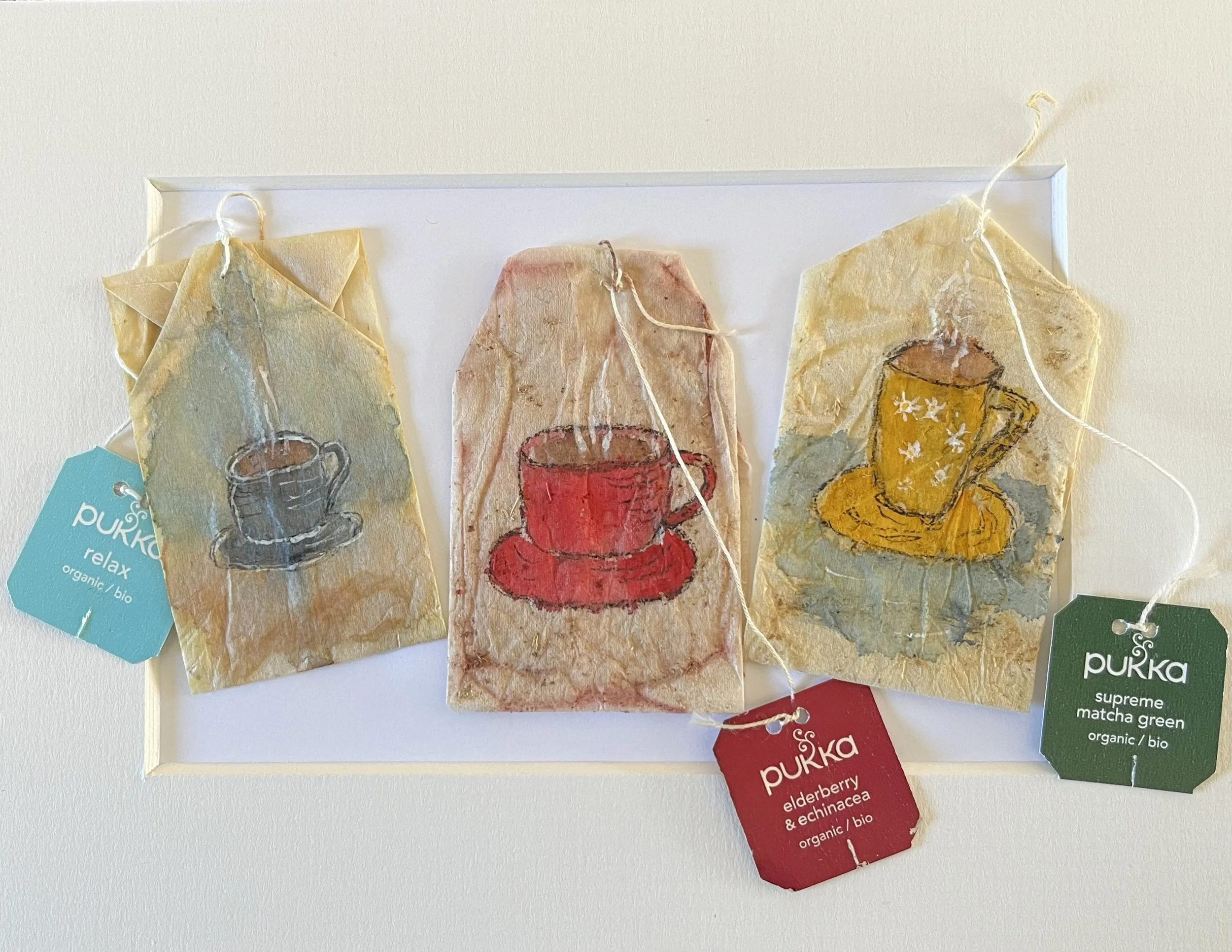 Det är kul att måla på förbrukade, torkade tepåsar. Torka påsarna, töm ut tebladen (kanske behöver du klippa upp tepåsen) och lägg i press ett par dagar. Sedan är det bara att testa sig fram. Jag har använt akvarellfärg i ganska tjock konsistens, vissa fält är målade ett par gånger. Det finns säkert andra tekniker du kan måla med oxå, det är bara att prova sig fram,:)