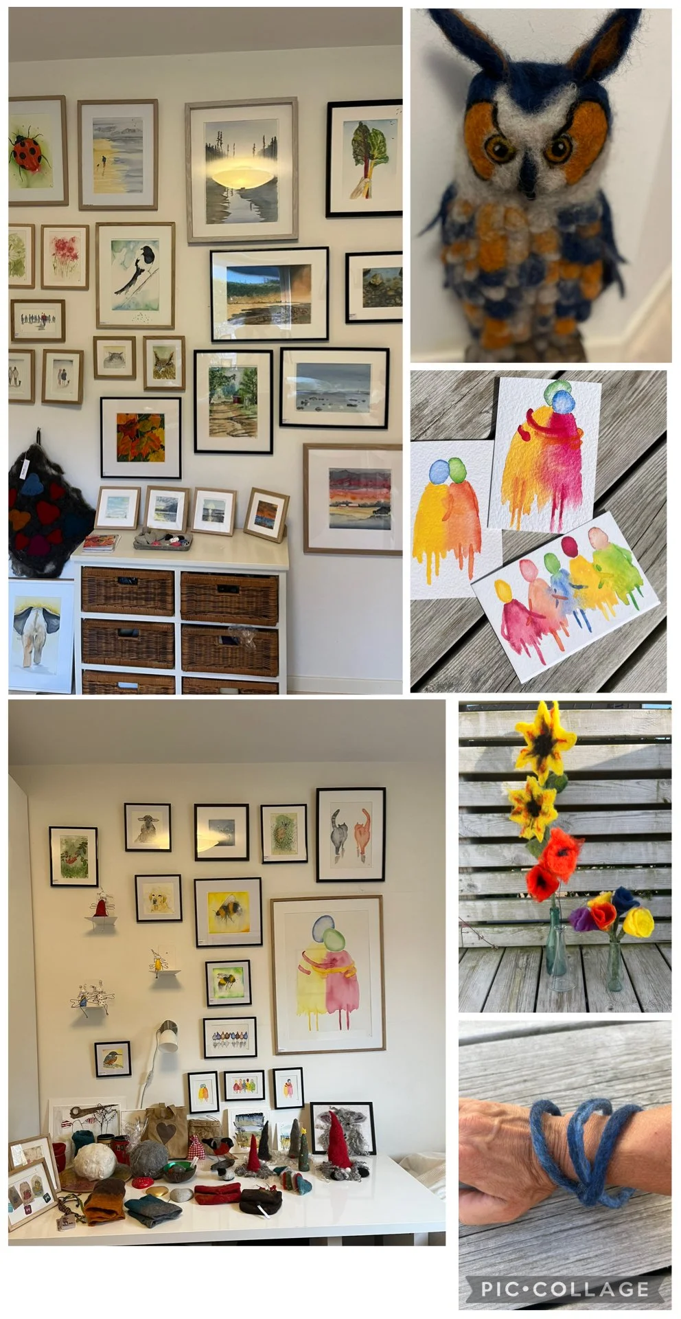 Tryckta kort, akvarelltavlor, tovade ullfåglar - hjärtan - blommor m.m.