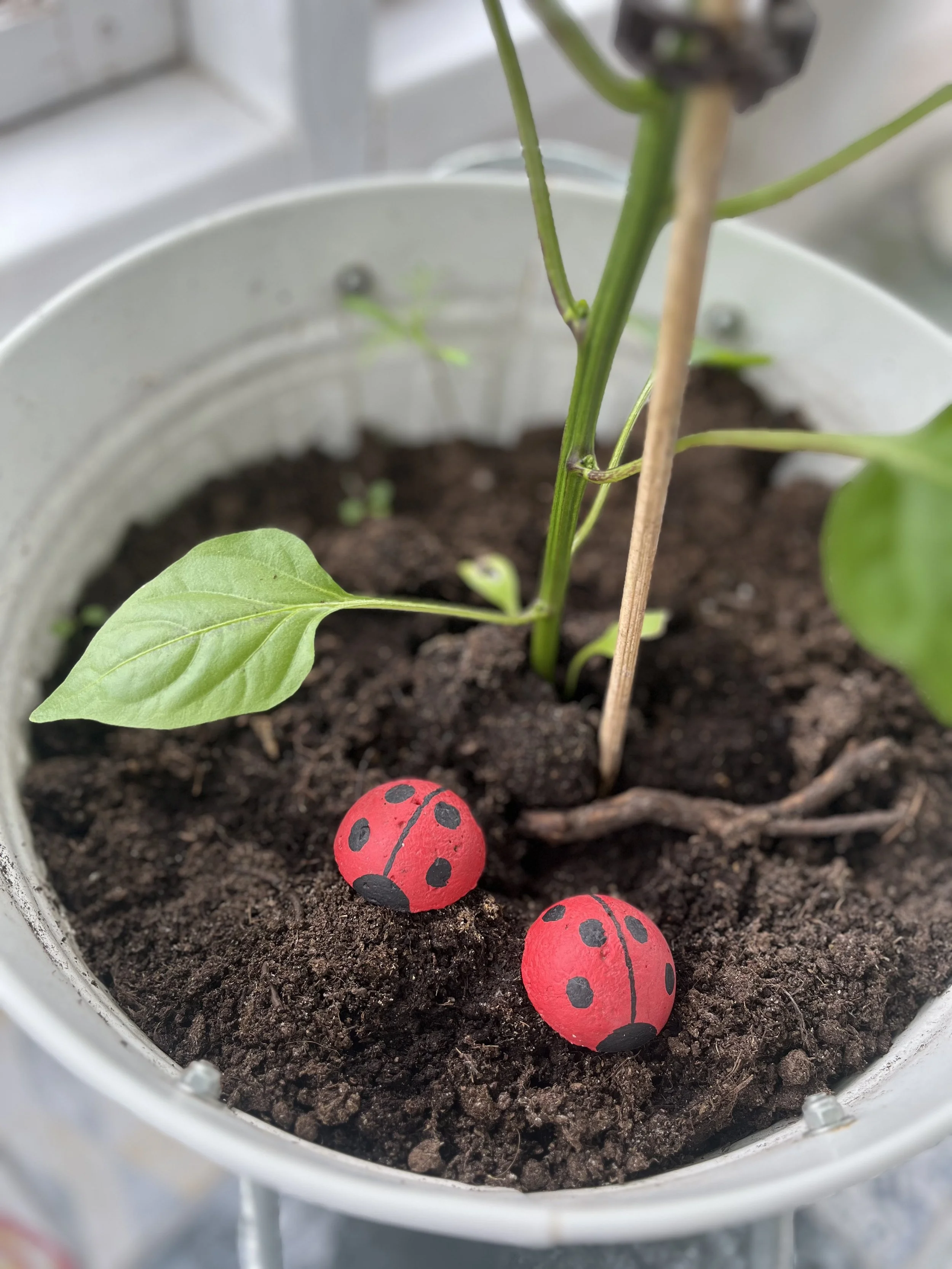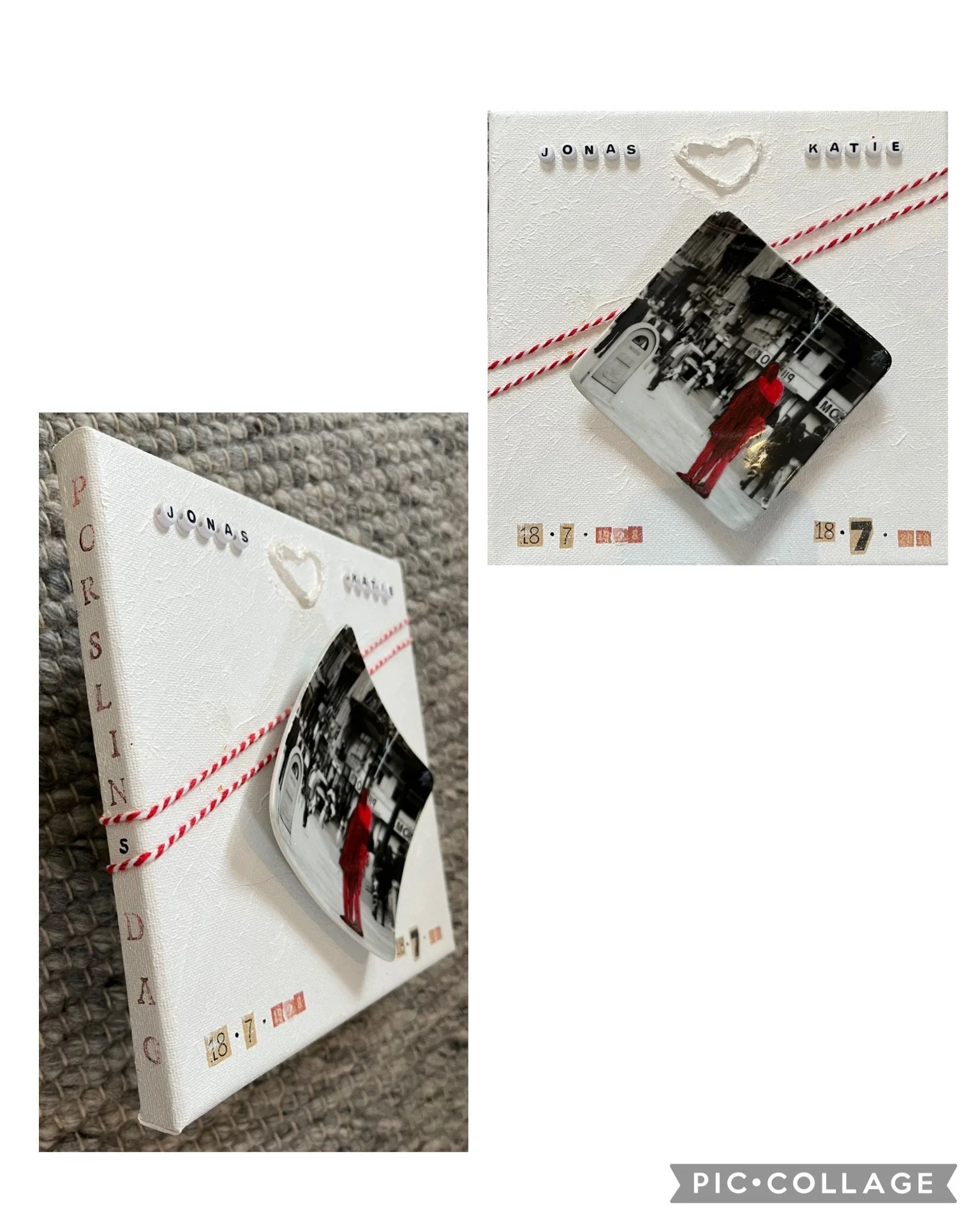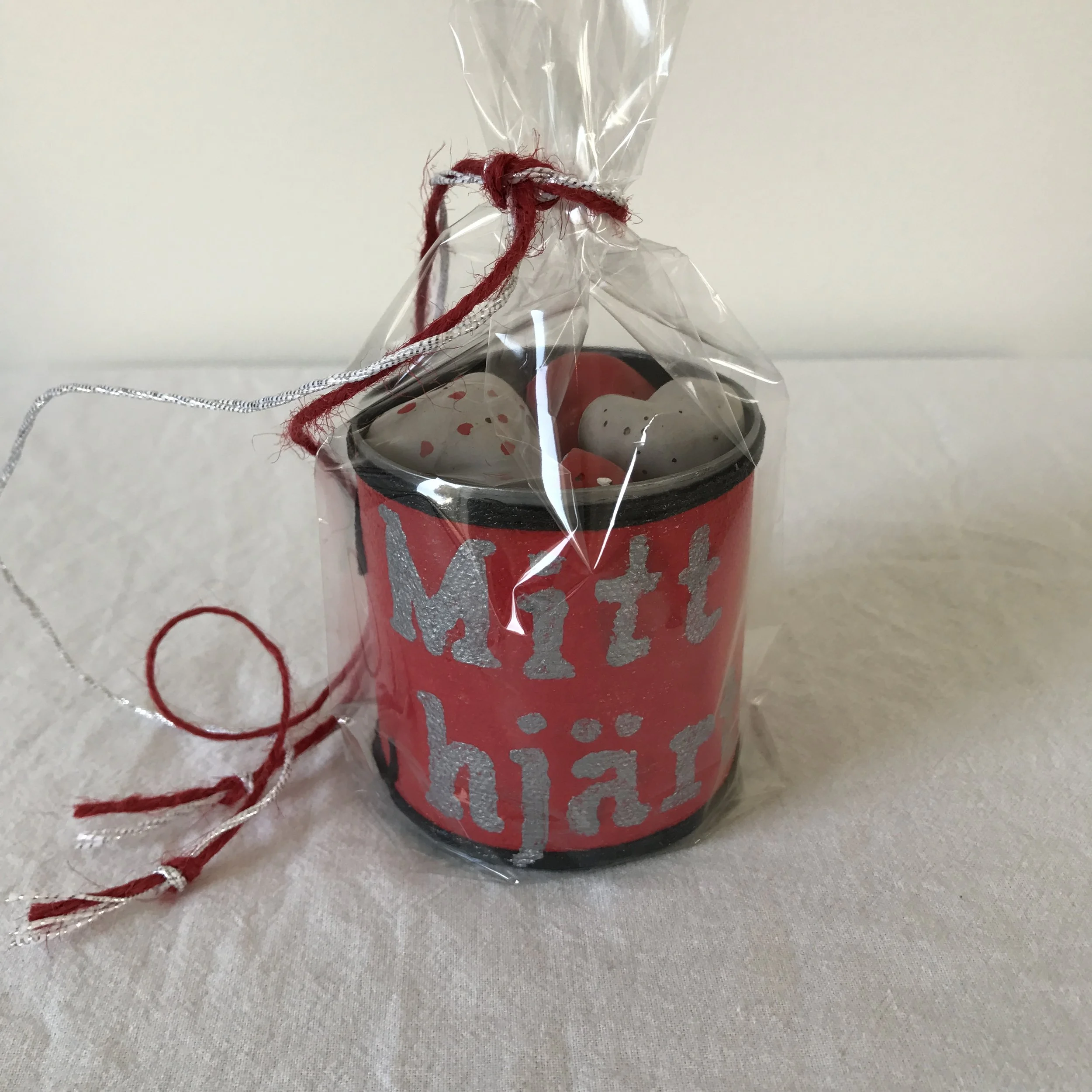 Målad och pyntad aluminiumburk, fylld med hjärtan i betong.