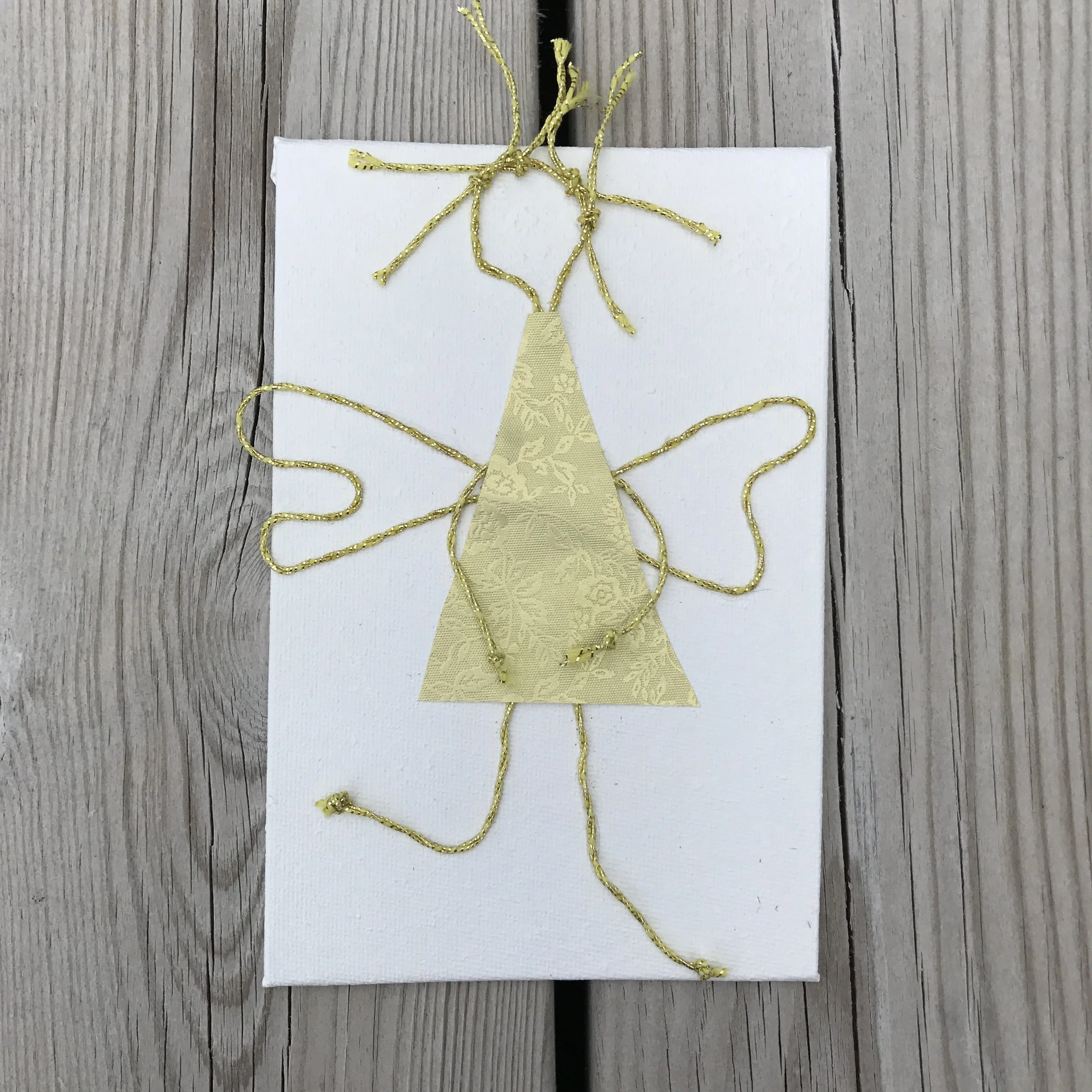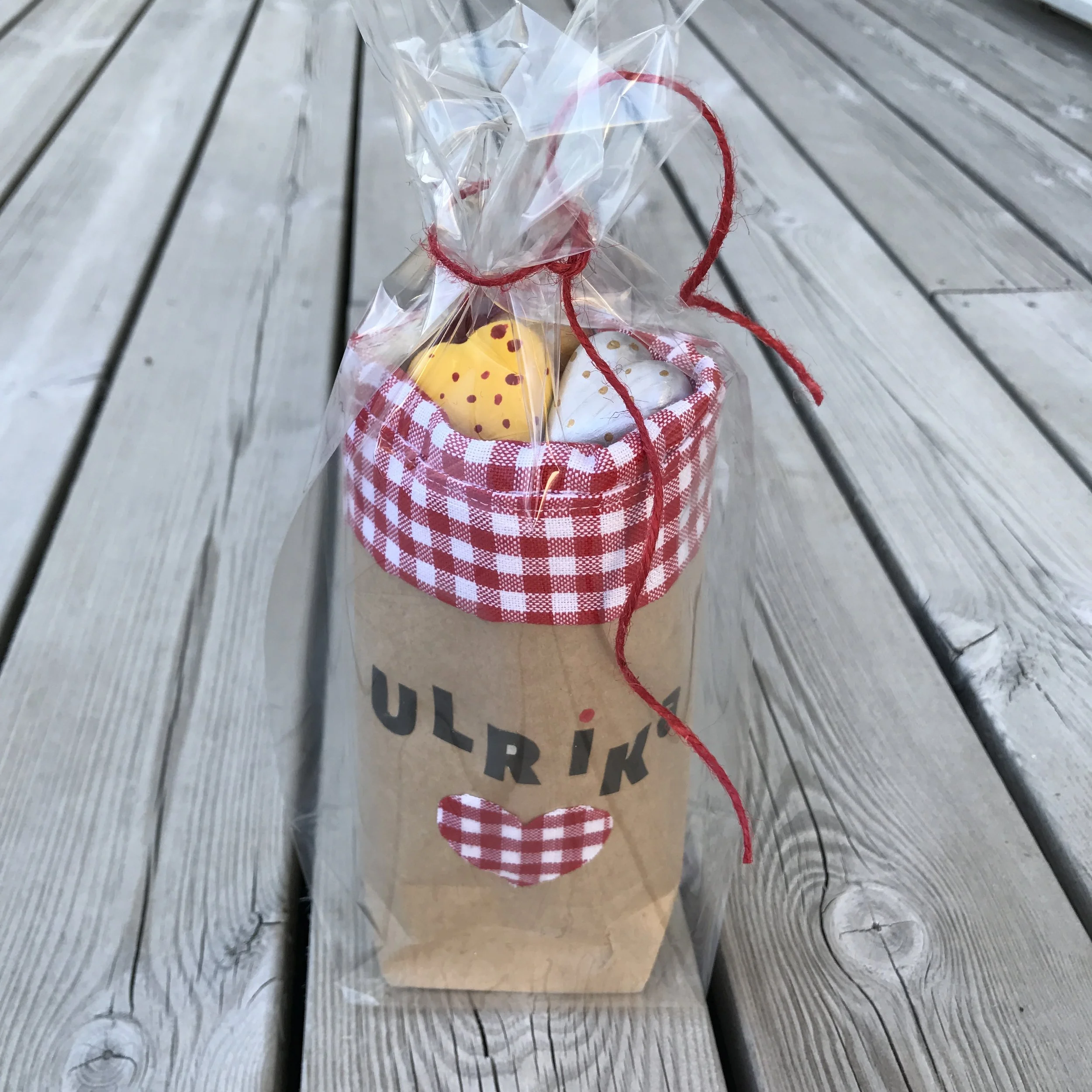 Papperspåse, klädd invändigt i tyg, fylld med hjärtan.